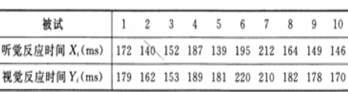 今测有10人的视觉、听觉反应时间(单位:毫秒)见下表,问视觉、听觉反应时是否具有一致性?