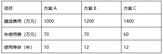 某化工厂有A、B、C三个建造方案,各方案指标如下表所示。设年利率为10%,按复利计息。试用全寿命费用指标评价方法选择最优方案。(A/P,10%,10)=0.1627,(A/P,10%,12)=0.1468。