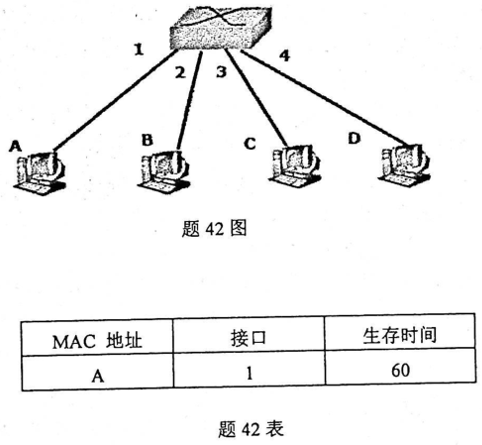 假设某局域网由一台交换机和四台微机组成,连接情况如题42图所示,当前的交换表如题42表所示。现在A要发送数据到B,B在收到A的数据后对A进行回复。对照题42图,简要说明此过程中交换机和相应主机的工作过程及交换表的变化情况。