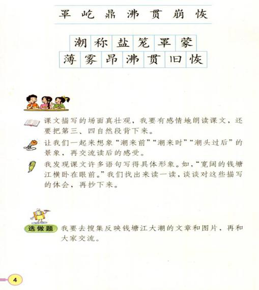 观潮钱塘江大潮,自古以来被称为天下奇观。农历八月十八是一年一度的观潮日。这一天早上,我们来到了海宁市的盐官镇,据说这里是观潮最好的地方。我们随着观潮的人群,登上了海塘大堤。宽阔的钱塘江横卧在眼前。江面很平静,越往东越宽,在雨后的阳光下,笼罩着一层蒙蒙的薄雾。镇海古塔、中山亭和观潮台屹立在江边。远处,几座小山在云雾中若隐若现。江潮还没有来,海塘大堤上早已人山人海。大家昂首东望,等着,盼着。午后一点左右,从远处传来隆隆的响声,好像闷雷滚动。顿时人声鼎沸,有人告诉我们,潮来了!我们踮着脚往东望去,江面还是风平浪静,看不出有什么变化。过了一会儿,响声越来越大,只见东边水天相接的地方出现了一条白线,人群又沸腾起来。?那条白线很快向我们移来,逐渐拉长,变粗,横贯江面。再近些,只见白浪翻滚,形成一堵两长多高的水墙。浪潮越来越近,犹如千万匹白色战马齐头并进,浩浩荡荡地飞奔而来;那声音如同山崩地裂,好像大地都被震得颤动起来。霎时,潮头奔腾西去,可是余波还在漫天卷地般涌来,江面上依旧风号浪吼。过了好久,钱塘江才恢复了平静。看看堤下,江水已经涨了两丈来高了。