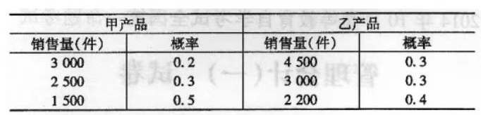 某公司准备在下一年度利用其剩余生产能力生产一种新产品。该公司现有甲、乙两种新产品可供选择。产品甲预计销售价格为500元,预计单位变动成本为300元;产品乙预计销售价格为300元,预计单位变动成本为180元。甲、乙两种产品的销售量是一随机变量,有关下一年销售预测资料如下表所示: