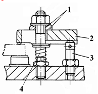 在图示螺钉-压板夹紧机构中,零件1、2、3、4的作用分别是______、______、______、______。