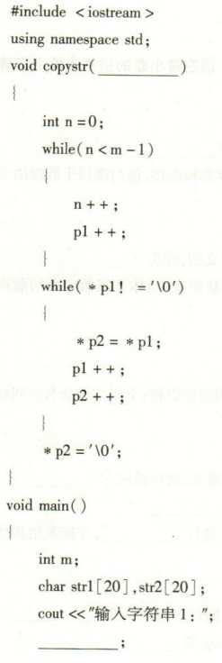 有一个字符串,包含n个字符。写一函数,将此字符串中从第m个字符开始的全部字符复制成为另一个字符串,请将程序补充完整。