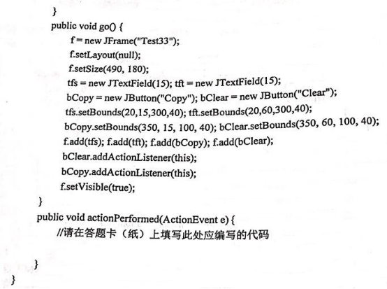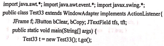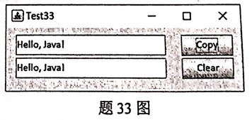 类Test33构造了2个文本域及2个按钮,如题33图所示。其中,“Copy”按钮的功能是将文本域tfs中的内容复制到文本域tft中,“Clear”按钮的功能是清空两个文本域。 注:要求你编写代码,实现单击两个按钮要完成的事件处理程序。