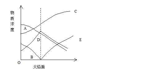 如图所示的层流火焰中,横向物质浓度的变化,包括燃料、氧气、燃烧产物和氮气分别可用____、_____、______、_____曲线来表示。