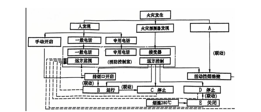 40.下图为建筑机械排烟系统联动控制图,机械排烟口为常闭状态,请写出方框内____ 字母对应的设备名称。A_______ B________C____D____E________