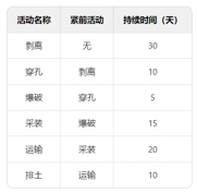 某大型露天煤矿开采项目,包括剥离、穿孔、爆破、采装、运输和排土等主要工序。为了更好地组织和管理项目进度,该煤矿决定采用网络系统工程方法进行规划和控制。右表是该项目的主要活动及其逻辑关系和持续时间估计: