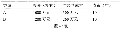 某项目有A和B两个备选方案,均能满足项目的需求,数据如题47表。请使用费用现值法比选最佳方案。