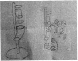 操场上新安装了一个投篮架(图1)。幼儿经常在这里玩投篮游戏。一天,几个幼儿带着笔刷和水桶来到这里(图2),他们先是快乐地粉刷投篮架,之后开始往篮筐里灌水,有的从上面灌,有的在下面接,再灌,再接……相互配合,反反复复,忙得不亦乐乎。