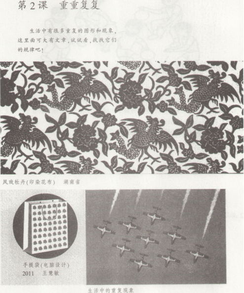 请根据上述材料完成下列任务: (1)试简述平面构成中“重复排列”的含义。(10分) (2)如何指导低学段小学生学习该材料,试拟定教学目标。(10分) (3)依据拟定的教学目标,设计教学过程并说明设计意图。(20分)
