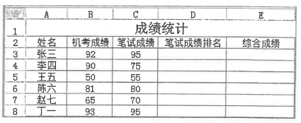 (2)在E3单元格中计算“张三”同学的“综合成绩”,综合成绩由机考成绩(占40%)和笔试成绩(占60%)组成。