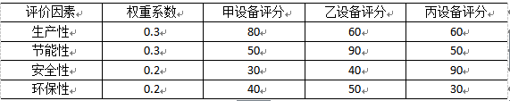 某公司报通过更新设备改造一条矿泉水生产线,预计改造后每年可节约费用25万元。现有甲、乙、两三种可供选择的设备,其购置费均为100万元,专家评审打分情况如下表所示。
