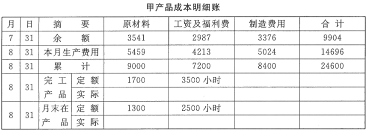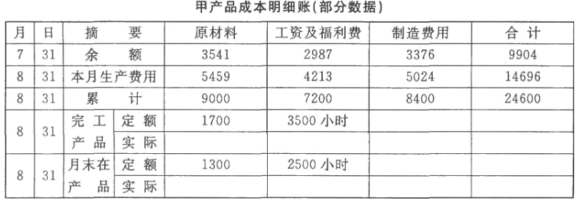 某企业某年8月甲产品明细账部分数据见下表,采用定额比例法分配费用。原材料费用按定额费用比例分配,其他费用按定额工时比例分配。明细账“工资及福利费”栏的“定额”行登记的是定额工时数。