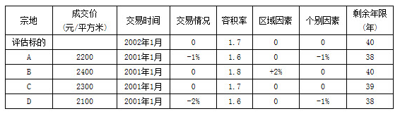 有一待估宗地,剩余使用年限为40年,折现率为6%,现收集到A、B、C、D四宗土地实例, 具体情况见下表。表中的交易情况、区域因素和个别因素都是参照物与评估标的相比较, 以评估标的为基准确定的数值。该城市此类用地容积率与地价的关系为:当容积率在1.5〜2 之间时,容积率每增加0. 1,宗地地价比容积率为1. 5时增加2%。该城市2005〜2009年, 每年地价指数上升1%。要求:试根据上述条件评估该待估宗地2009年1月的价值。