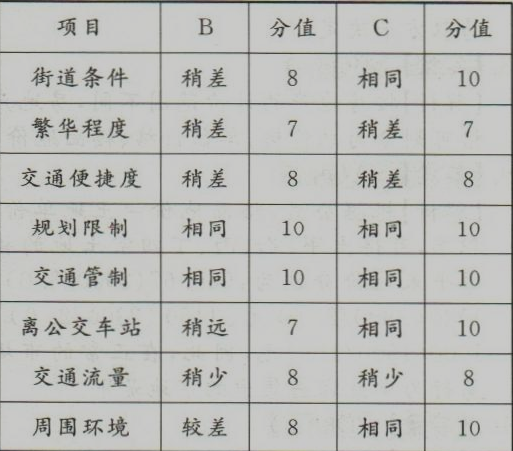 交易实例A与待估对象处于同一地区,B、C的区域因素修正关系情况可参照下表进行判断。