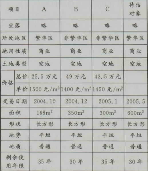 待评估地块为一商业用途的空地,面积为600m²,要求2005年5月对其进行评估。评估人员通过搜集有关数据资料(过程略),选出3个交易实例作为比较参照,交易实例有关情况见下表。