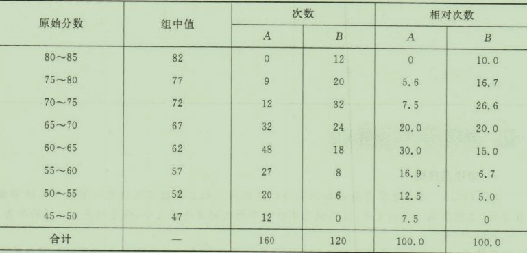 (2)在分组归类统计数据中,A、B两校学生测验数据各划分成几组?