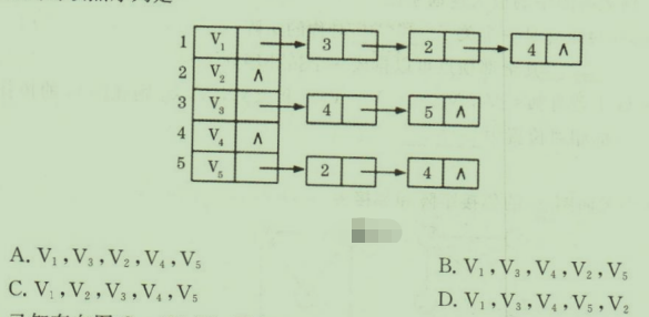 一有向图G的邻接表存储结构如图所示。现按深度优先遍历算法,从顶点V₁出发,所得到的定点序列是