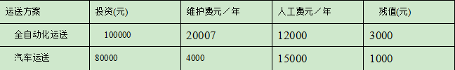 某项目生产中需要材料运送设备,可选方案有下表所列两种:全自动化运送和汽车运送。若两方案寿命周期均为10年,年利率为10%,试用年费用法确定较优方案。