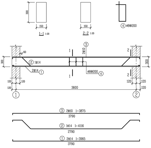 根据钢筋混凝土梁的立体图和钢筋详图,绘制该梁的2-2断面图。