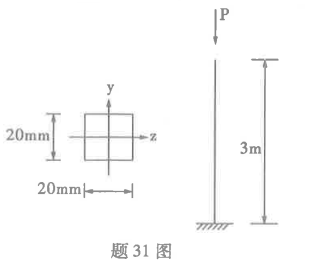 题31图示约束条件为一端固支,一端自由的方形截面轴向受压杆件,求该杆的压杆稳定临界力。已知该杆为细长杆,弹性模量E= 200GPa。