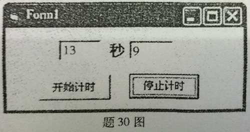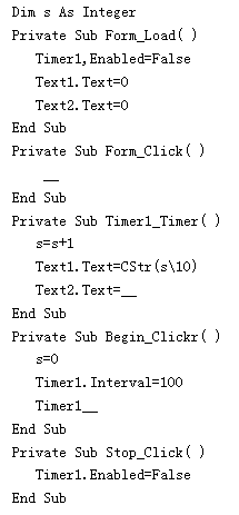 设计一个计时程序。该程序用户界面如题30图所示,由两个文本框显示时间:秒(Text1)和十分之一秒(Text2);两个按钮进行操作:开始计时按钮(Begin)、停止计时按钮(Stop)。另还有计时器控件Timer1。程序运行后,单击开始计时按钮,则开始计时,文本框中显示秒数;单击停止计时按钮,则计时停止;单击窗口则退出程序的执行。