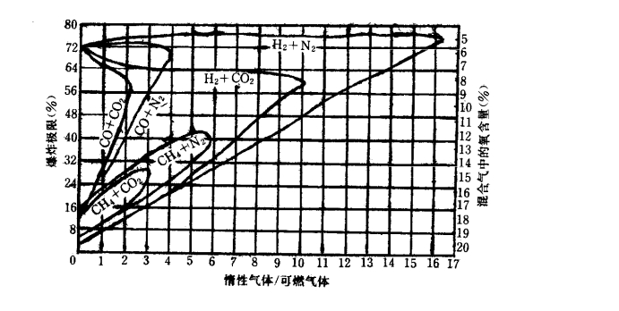 己知某种煤气的组成:一氧化碳一10.5%、氢气—47%、甲烷—29%、氮气—10.5%、二氧化碳—2.5%和氧气—0.5%,试求这种煤气的爆炸极限。混合气体的爆炸极限图如图所示。