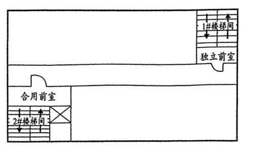 某办公楼地上共36层,层高3.5m,该办公楼东西两侧分别设置有疏散楼梯间, 分别为1#防烟楼梯间及独立前室,2#防烟楼梯间及合用前室,两部防烟楼梯间及其前室、合用前室均靠外墙,如下图所示。